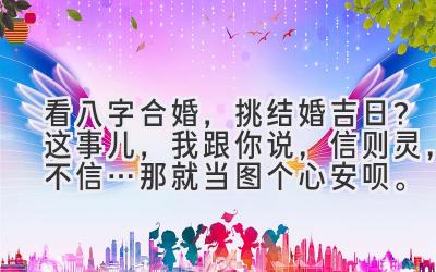 至于你问我,要不要看 八字合婚 ,选 吉日 ?我觉得,如果你信,那就去看看,图个心安。如果不信,也没必要强求。最重要的是,你要相信自己的选择,相信你和你的另一半,能够一起创造美好的未来。