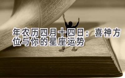 2020年农历四月十四日,喜神降临,将带来好运与祝福。希望这篇文章能帮助你更好地理解这一天你的星座运势,以及喜神方位的影响,并为你带来好运。记住,每个人的命运都掌握在自己手中,努力奋斗,相信自己,你将会拥有更加美好的未来!