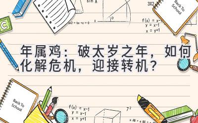 2020年,对于属鸡的朋友来说,是充满挑战的一年,因为他们迎来了“破太岁”之年。破太岁意味着这一年运势低迷,容易遭遇挫折,财运不济,甚至小人作祟,事业受阻,婚姻不顺,健康堪忧。但这并非意味着属鸡人要被命运摆布,只要掌握化解之法,就能化险为夷,迎接转机。